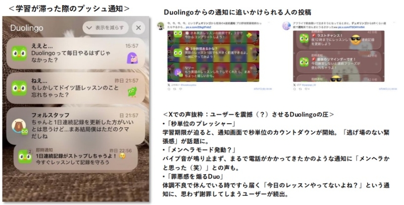 Duolingoの特徴のひとつが、この“少し強め”とも言われる通知です。学習が途切れそうになると、タイミングよく届くメッセージは、ときに「怖い」と言われるほど印象的で、SNS上でも話題になることがあります。