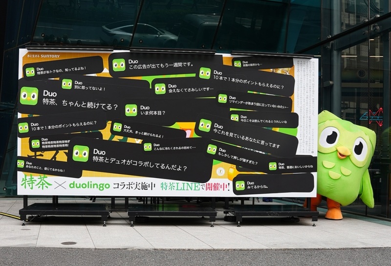 その正体は、語学アプリで知られるDuolingoのキャラクター「デュオくん」です。普段はスマートフォンの中で、少し強めに学習を促してくるあの存在が、なぜか現実の街に現れ、広告そのものを“上書き”していました。