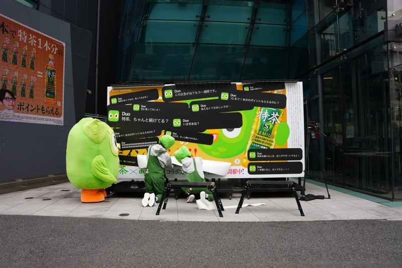 現場に現れたのは、語学学習アプリDuolingoのキャラクター「デュオくん」。緑色の大きなフクロウの姿で知られるあの存在が、実際に街中に登場し、作業員に指示を出しながら広告の“上書き”を進めていきました。