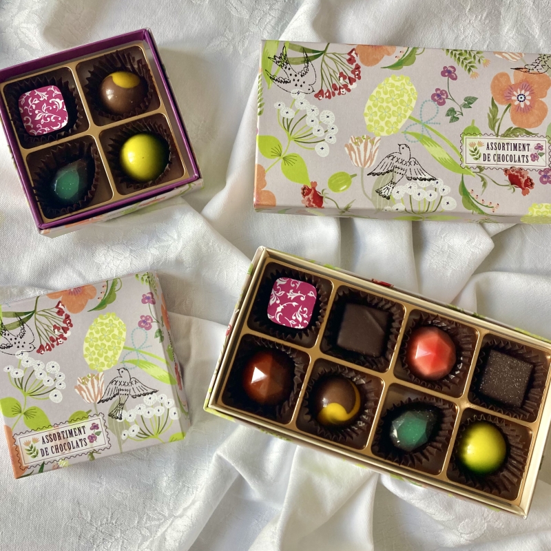 4種のフルーツガナッシュを閉じ込めたマカロンを、チョコレートでコーティングしたぜいたくな一箱。パッション、フランボワーズ、アプリコット、ライム…それぞれの果実感がしっかりと感じられチョコレートとの相性も抜群です。