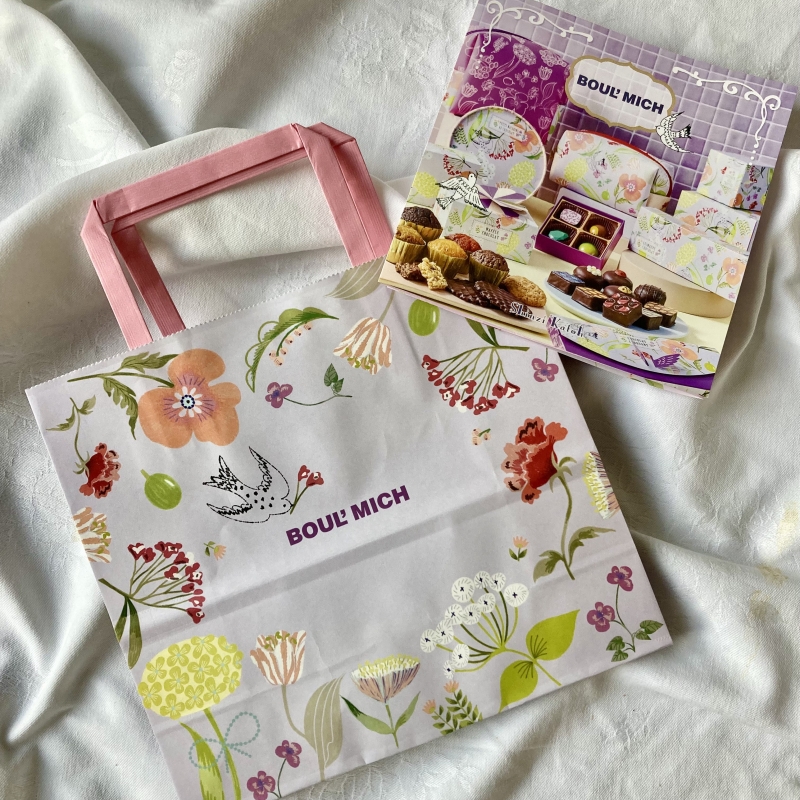 専用のクラシカルなフローラルモチーフをあしらった紙袋は、持っているだけで気分がふわっと上がる存在。ブールミッシュのロゴをやさしく取り囲むように咲く花々が、日常にそっと彩りとリズムを添えてくれます。