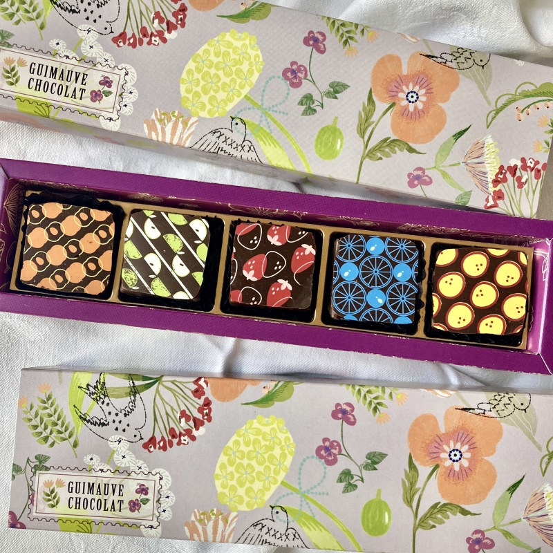 5種類のフルーツ果汁をぎゅっと凝縮した香り高いギモーヴをチョコレートでコーティング。ふわっと軽い食感の中に、果実の風味がじんわり広がります。アプリコット、青リンゴ、苺、ライム、パッション…それぞれ個性があり、ひとつずつ味わうのが楽しいラインアップ。食感の変化を楽しみたい方にぜひ試してほしいスイーツです。