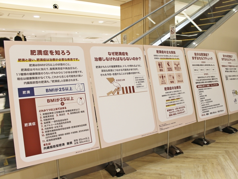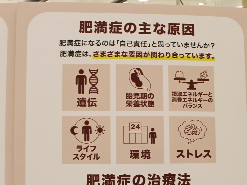 この展示が伝えるように、肥満症治療の目的は、慢性腎臓病や心血管病、動脈硬化など、肥満症がもたらす深刻な疾患を予防・改善することにあります。