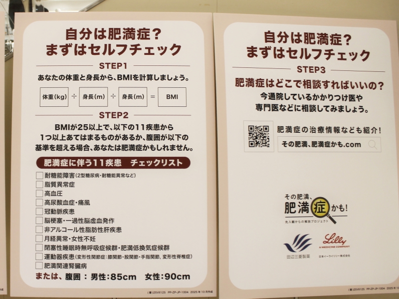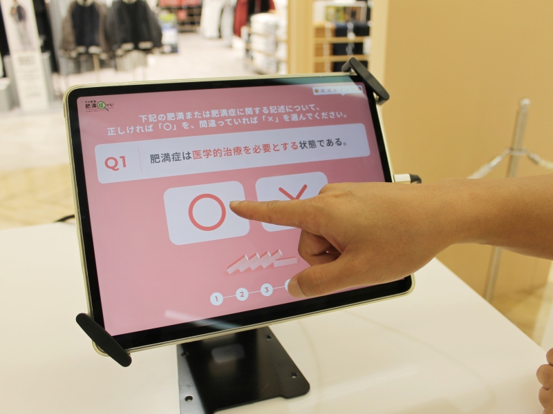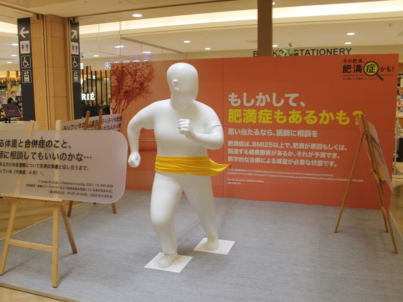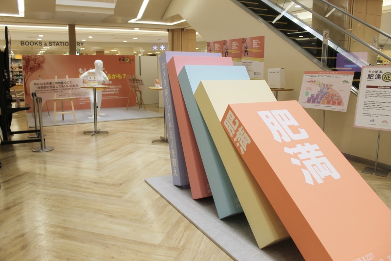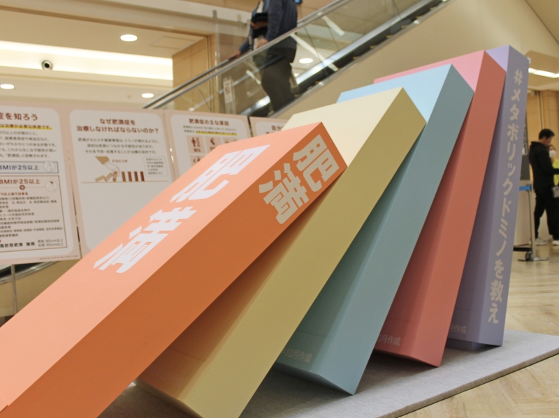 イベントでは、「メタボリックドミノ」をイメージしたドミノオブジェ展示のほか、セルフチェックやクイズコーナーも。“肥満と肥満症の違い”を楽しみながら学べるコンテンツに、お客さんたちは足を止めて興味深く見入っていました。