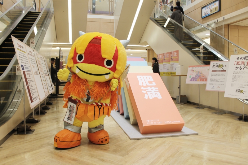 イオンモール秋田内のイベントスペースでは、案内役の秋田県PRキャラクター「んだッチ」がお出迎え。肥満症に関するさまざまなコンテンツを紹介してくれました。