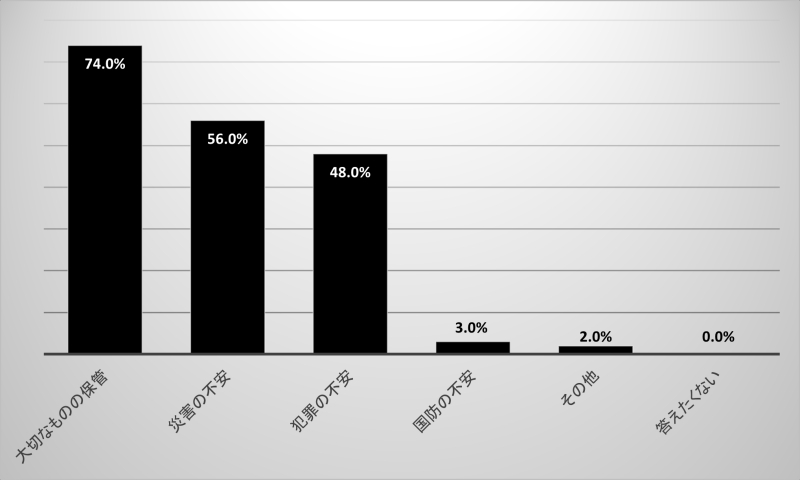金庫を選んだ理由の多くが「大切なものの保管」や「災害対策」であることがわかります。背景には、防災や防犯への意識が高まりつつある現在の生活トレンドがあります。