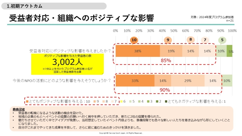 また、この変化は職員自身だけにとどまりません。支援を必要とする受益者への対応にも良い影響が広がり、3000人を超える受益者にポジティブな変化が届けられたという結果も示されています。新しいアイデアが生まれ、活動が発展した事例や、企業からの協賛が得られるようになったケースもあり、現場の取り組みに新たな動きが生まれています。