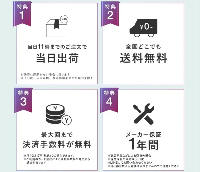 正規品以外での購入だと、万が一の不具合やトラブルに対応してもらえないことがあります。公式サイトなら正規品が保証され、万一の際もアフターサポートを受けられる安心感があります。 - 限定特典が付く場合がある