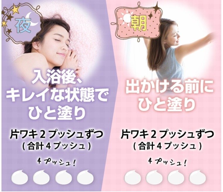 基本的な使用方法はとてもシンプルで、朝と夜の1日2回ケアが推奨されています。特にワキガの原因菌は寝ている間に活発化するため、夜のケアが大切です。