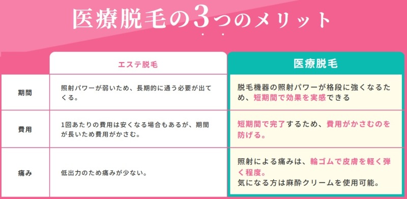 エステ脱毛と違い「効果が弱くて通い続ける」というリスクが少なく、トータルコストを抑えやすいとされています。 - 痛みが少ない