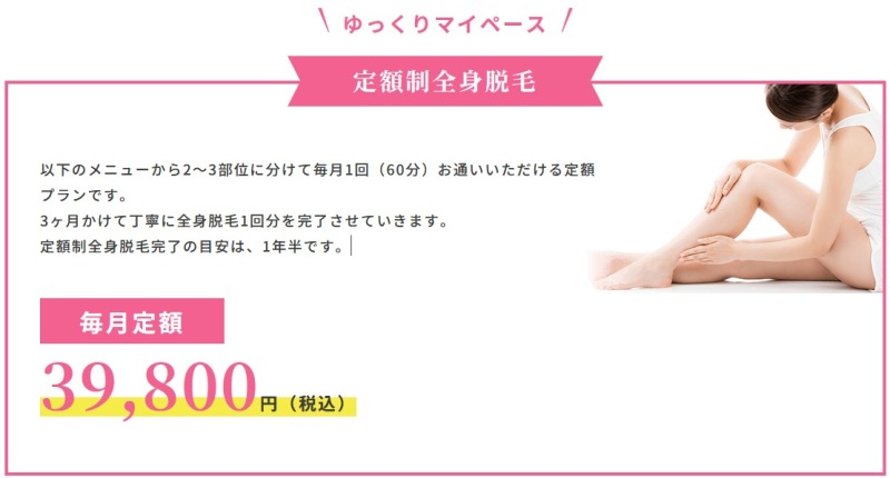 - 全身脱毛:数十万円単位(回数や範囲により変動)