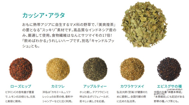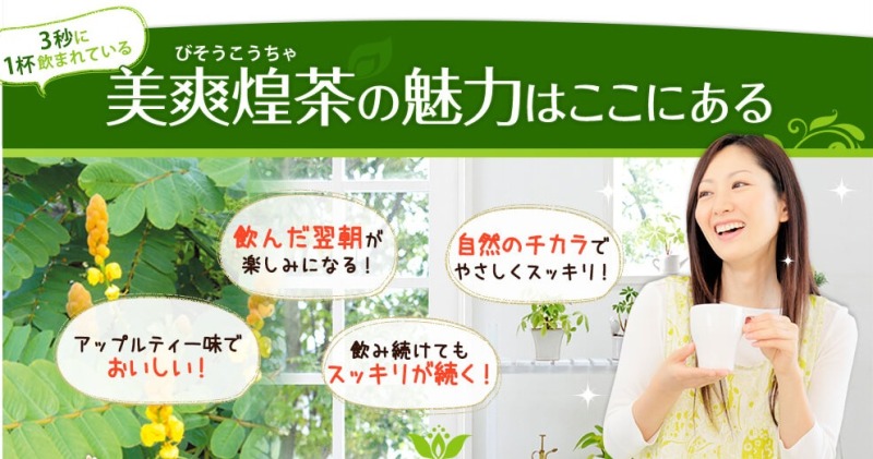 美爽煌茶(びそうこうちゃ)は、便通改善や体の内側からのスッキリ感をサポートするために開発された健康茶です。主成分には「カッシア・アラタ」をはじめとした複数の天然ハーブが使用されており、100%植物由来のブレンドになっています。人工的な成分を含まないため、自然志向の方や、安心して続けたい方に適しています。
