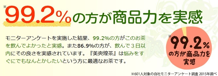 口コミで高い評価を受けている美爽煌茶ですが、実際に多くの人に支持されているのには理由があります。販売元が行ったモニター調査では、実感率99.2% という驚きの数字も出ています。ここでは選ばれる主な理由を整理しました。