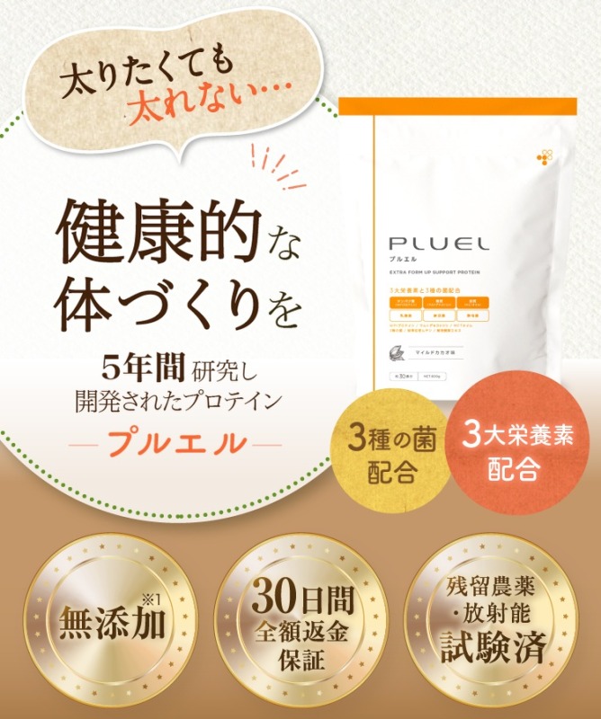 プルエルプロテインは、「食べても太れない」人のために開発された新発想のプロテインです。