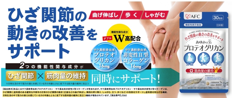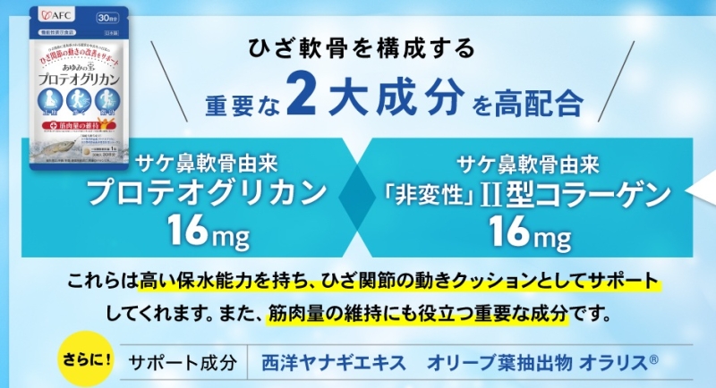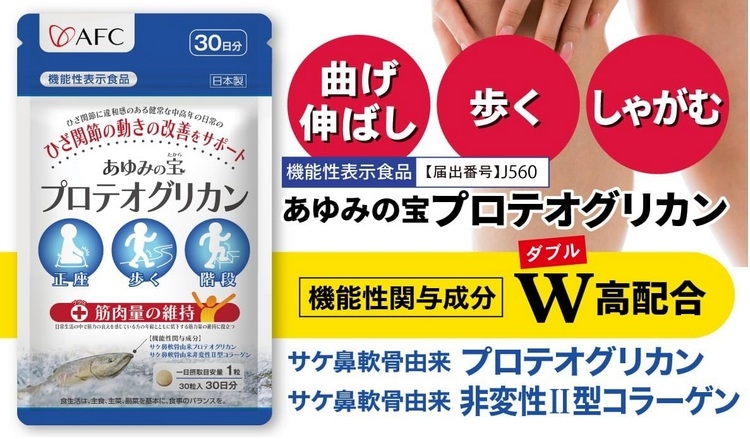 サケ鼻軟骨由来のプロテオグリカンとⅡ型コラーゲンを配合し、ひざの動きをサポートする機能性表示食品(届出番号:J560)として話題になっています。