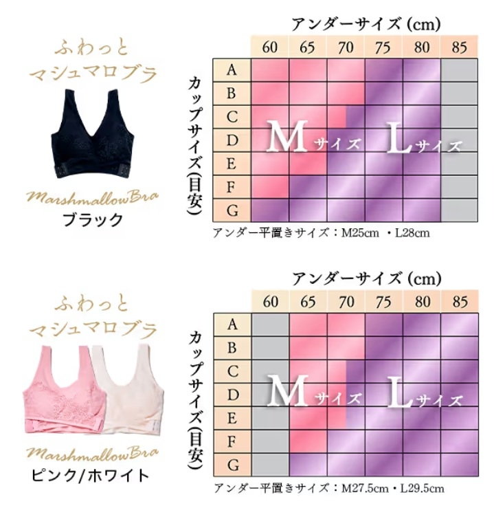 ふわっとマシュマロブラは、以下のサイズ展開になっています。