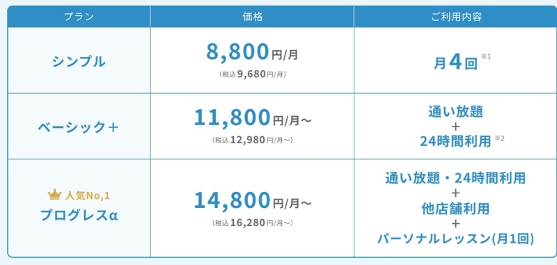 どのプランも「続けやすさ」と「コスパの良さ」を重視しており、忙しい人でも無理なく通える設計です。