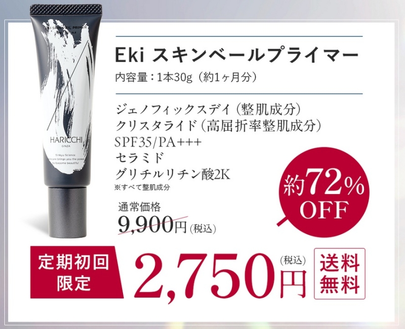 72%OFFの初回限定2,750円(税込・送料無料)キャンペーンを実施中の今、Ekiスキンベールプライマーが気になる方は、ぜひこの記事を参考にしてみてください。![]()