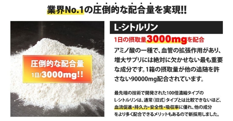 - 主成分のL-シトルリンは1日あたり3000mg配合。