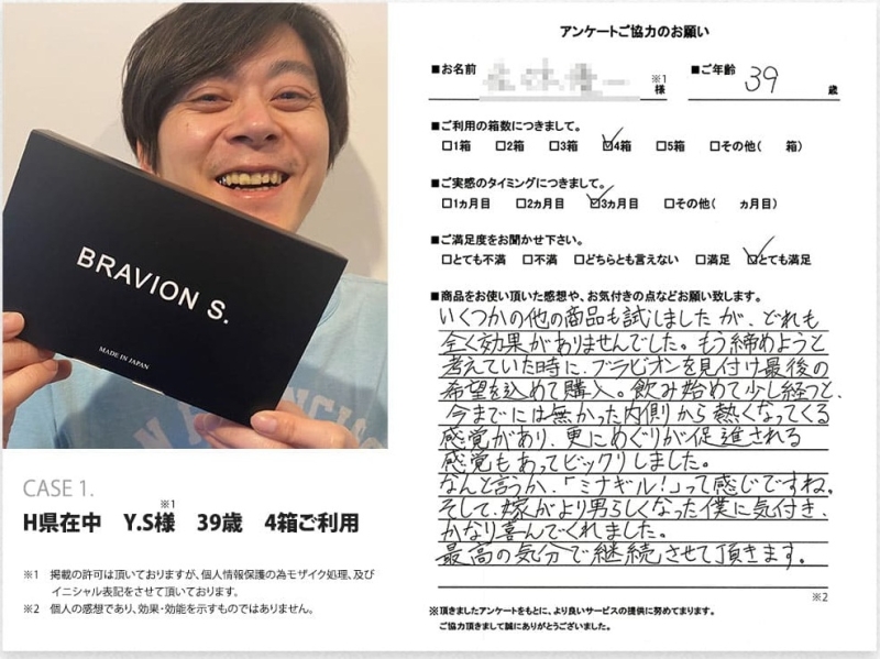 これまでいくつか試してダメだったが、ブラビオンSは飲み始めてすぐに朝の感覚が変わった。 - 「1か月で自信が戻った」