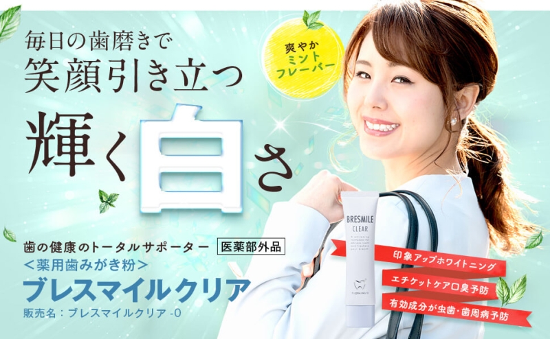 ブレスマイルクリアは、「歯の黄ばみ」「口臭」「爽快感の持続」といった口内の悩みをトータルでケアできる薬用歯みがき粉です。