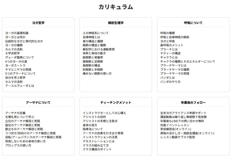カリキュラム全体を見ると、基礎理論からポーズの実践、指導者としてのスキルまで一貫して学べる内容になっており、オンラインでも“資格取得後に使える実力”をしっかり身につけられる構成になっています。