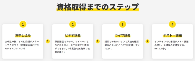 公式サイトでも案内されている 4つのステップ に沿って進めれば、オンラインでも無理なくRYT200の取得がめざせます。