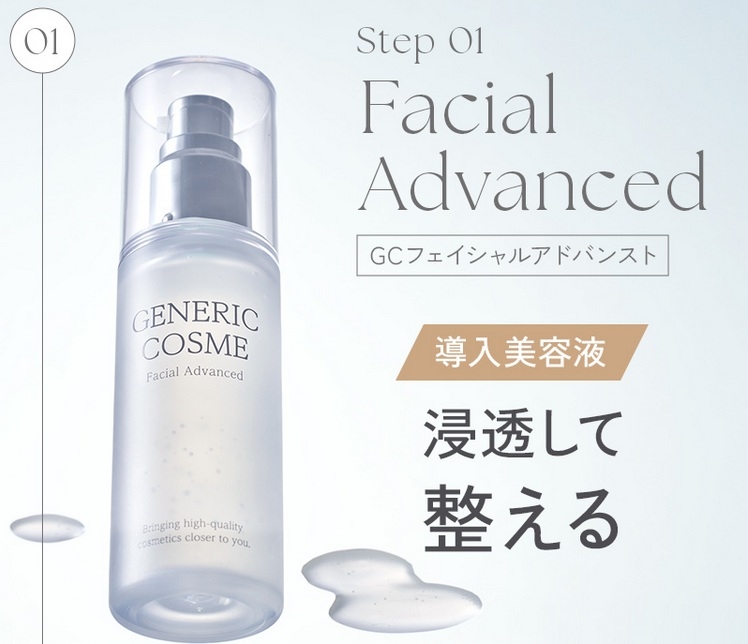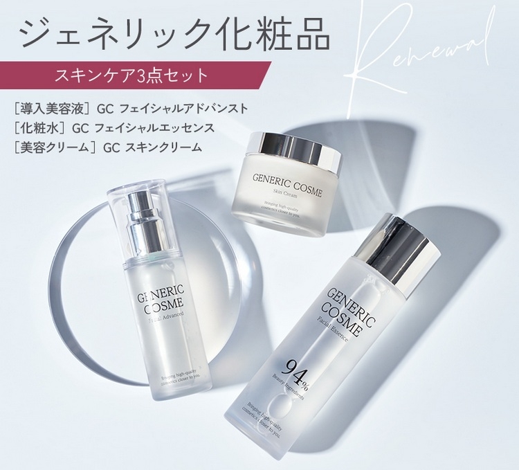 ジェネリック化粧品は、導入美容液 → 高濃度化粧水 → クリーム の3ステップでスキンケアが完結します。