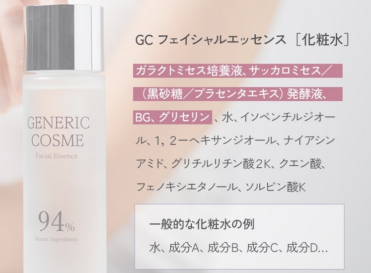 ジェネリック化粧品の化粧水は、水をほとんど加えず、美容成分だけで構成されたような贅沢な設計が特徴です。