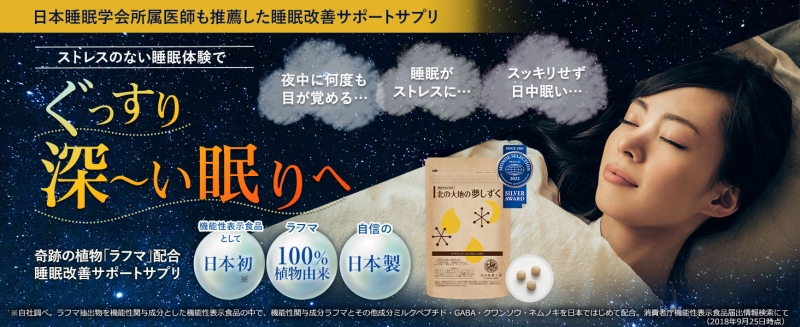 睡眠に関わる体内の流れに着目し、ラフマ由来成分を中心に複数の成分を組み合わせた機能性表示食品です。