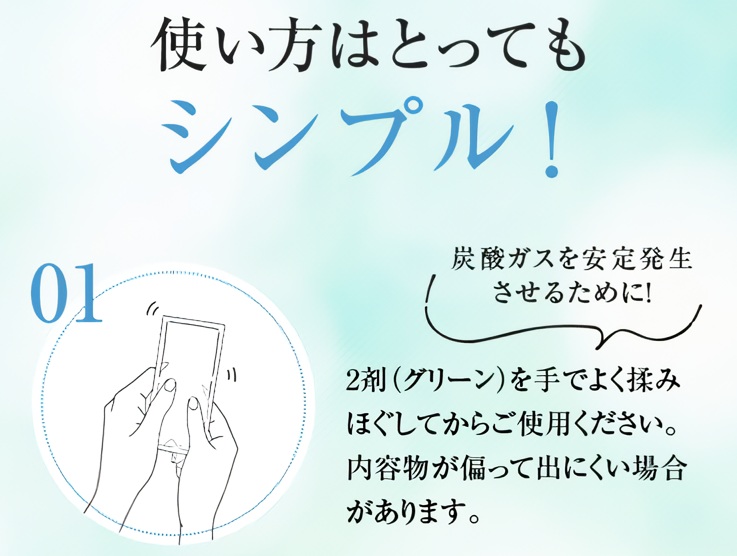 これらを使用時に混ぜ合わせることで炭酸ガスが発生し、肌にのせてケアを行います。