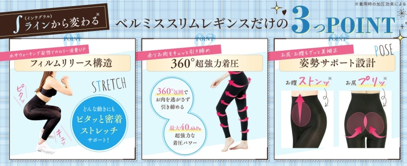 ベルミス レギンスは脚だけでなく、ヒップやウエスト周りにも配慮した設計がされています。