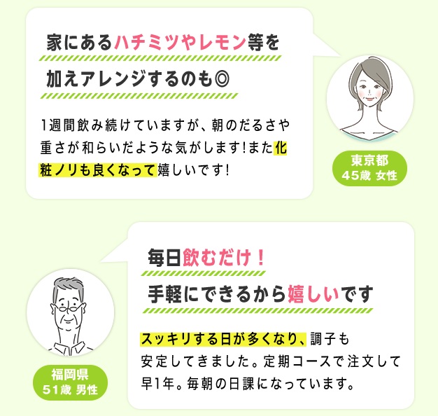 毎朝なんとなく重さを感じていたが、続けていくうちにスッキリした感覚があるという声。習慣化することで変化を感じやすいという意見が見られます。 - 無農薬で安心して飲めるのが決め手だった