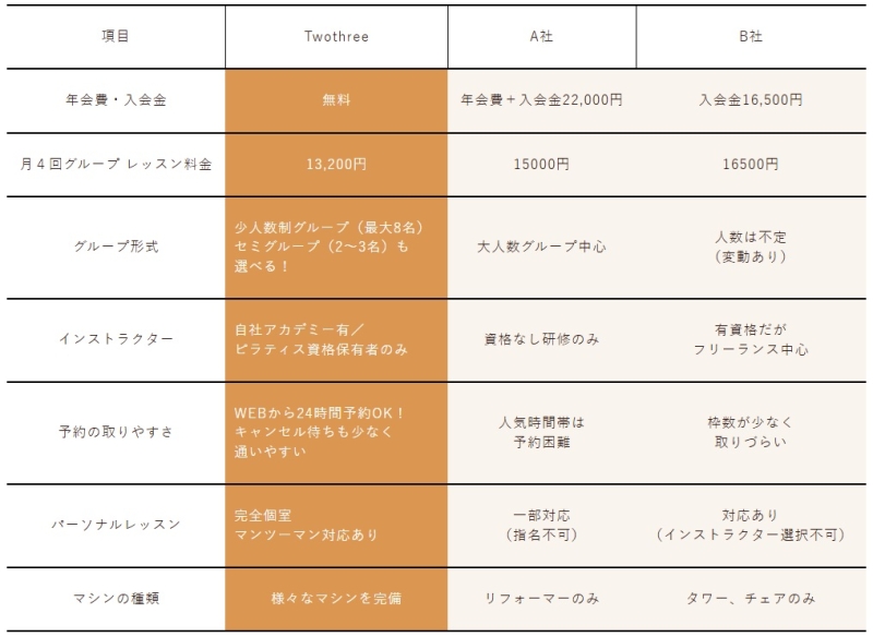 TwoThreeピラティス(ツースリーピラティス)を他社スタジオと比較