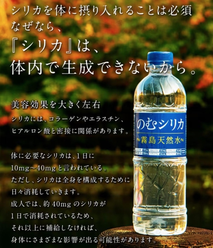 のむシリカは、鹿児島県・霧島の自然環境で採水されたナチュラルミネラルウォーターです。中でも注目されているのが「シリカ(ケイ素)」と呼ばれるミネラルで、日常的に取り入れたい成分として近年関心が高まっています。