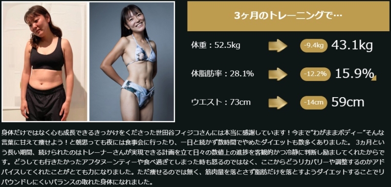 極端なダイエットではなく、継続しながらしっかり変化を出している点が、世田谷フィジコの特徴といえるでしょう。