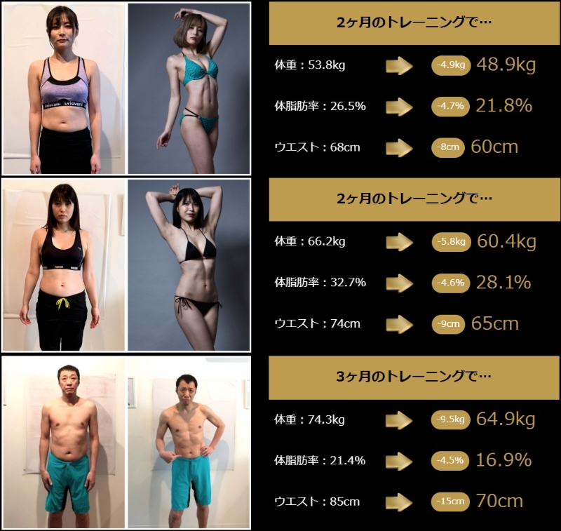 実際にトレーニングを受けた方のビフォーアフターを見ると、体重だけでなく体脂肪率やウエストなど、見た目に直結する部分でしっかり変化が出ていることがわかります。