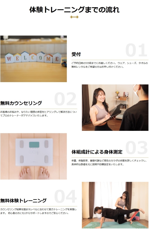 ここで目標設定も具体的になるため、今後のイメージがしやすくなります。 - 体験トレーニング 実際のメニューを体感