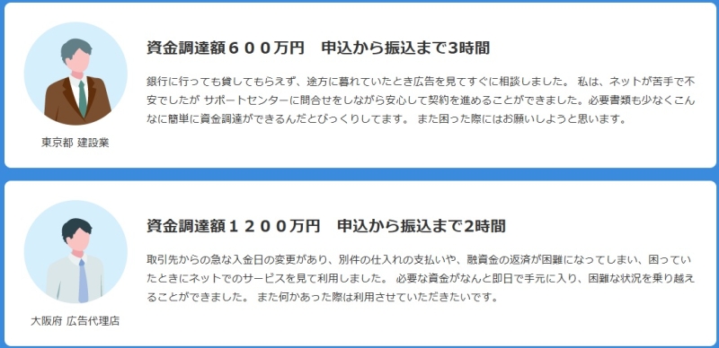 担当者とのやりとりもテンポよく進むため、資金繰りが厳しいときでも時間を取られにくい仕組みです。