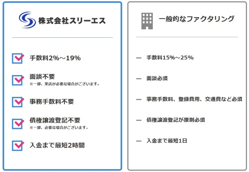 ファクタリング会社は数多くありますが、スリーエスは「スピード」「手数料」「使いやすさ」の3点で一般的なファクタリングと大きく異なります。