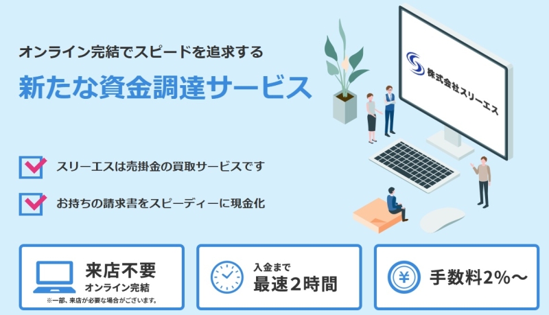 スリーエス(株式会社スリーエス)が提供するファクタリングサービスは、売掛金を早期に現金化し、急な支払いにも対応できる“スピード特化型”の資金調達サービスです。