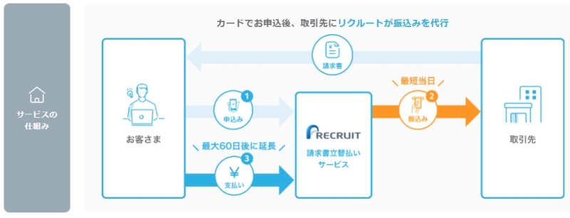 通常であれば、請求書に記載された期日までに銀行振込などで支払いを行います。しかし、このサービスを利用すると、立替会社が取引先へ先に振込を行い、その後利用者はクレジットカードで支払います。