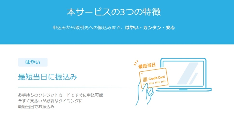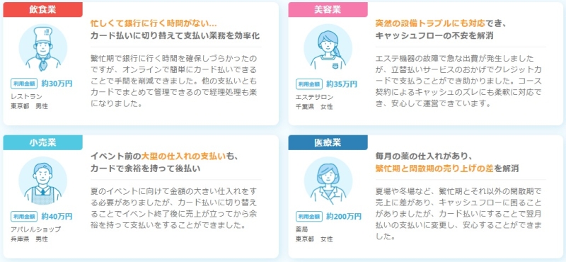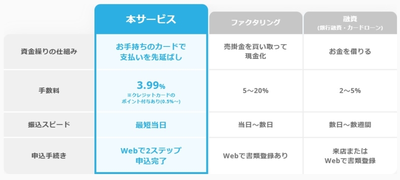 借入ではないため金融機関との契約も不要で、クレジットカード決済を活用して支払いタイミングを調整できます。特に、入金サイトが長い業種や急な出費が発生しやすい事業者にとっては、資金繰りの選択肢の一つとなり得るサービスです。