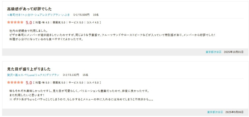 口コミを総合すると、「料理の味・見た目・使いやすさ」の3点が特に評価されており、幹事目線で安心できるケータリングサービスという印象です。