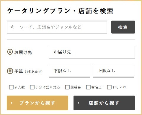 公式サイトの検索フォームに「人数」「予算」「エリア」「形式(オードブル/ケータリング)」を入力するだけで、条件に合うプランを一覧表示できます。