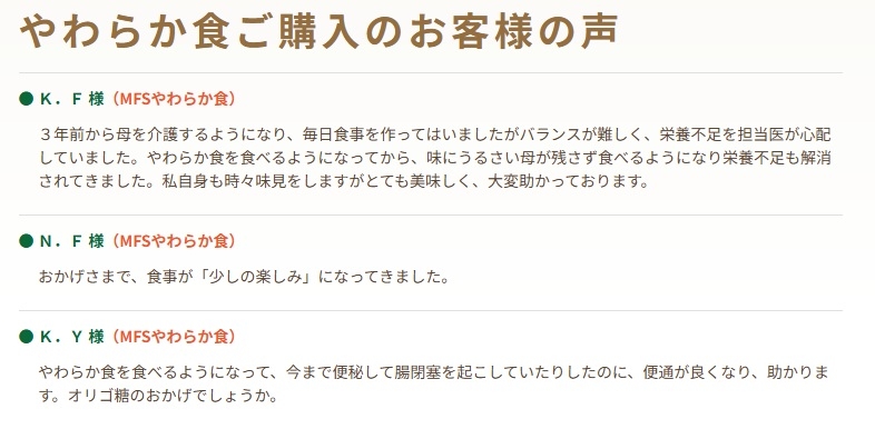噛む力や飲み込む力が弱くなってきた方でも食べやすい食事が選べる点を評価する口コミもあります。高齢の家族の食事として利用しているケースも多いようです。