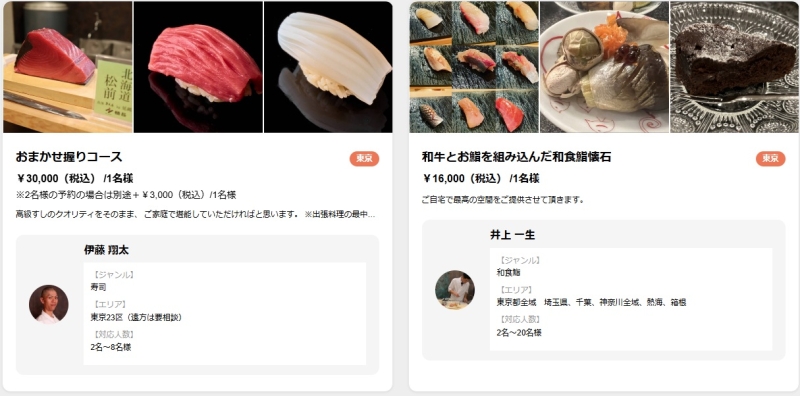自宅のキッチンで調理を行うため、ある程度のスペースが必要になる場合があります。 - 予約状況によっては希望のシェフが取れないこともある