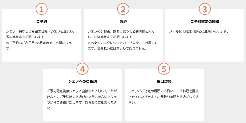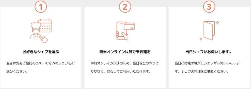 サイトで料理ジャンルや空き状況を確認し、希望のシェフを選びます。 - オンライン決済で予約確定