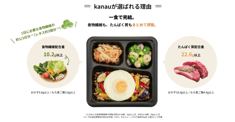 多くの宅食サービスが「たんぱく質」にフォーカスしている中で、kanauは食物繊維にも注力している点が特徴です。
