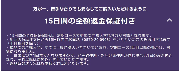 加えて、公式サイトで購入した場合は 全額返金保証 がついています。万が一香りが合わなかったり、期待と違ったと感じた場合でも、商品到着日から15日以内なら返金に対応してもらえるため安心です。この保証は公式購入者のみが対象で、他の販売ルートや転売品では受けられません。